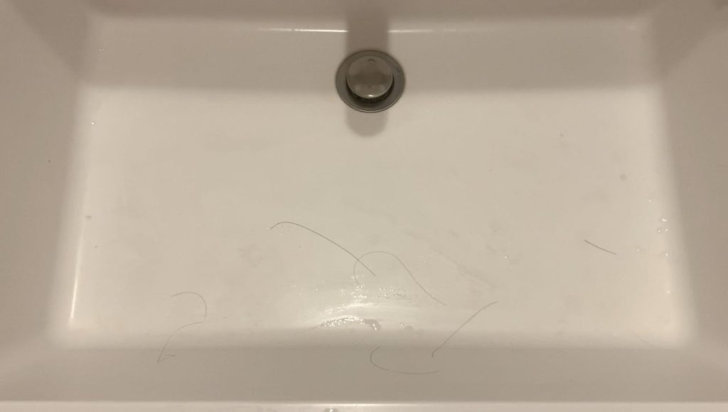 📸 (写真⑦:洗面所に落ちた抜け毛を見つめる手元)